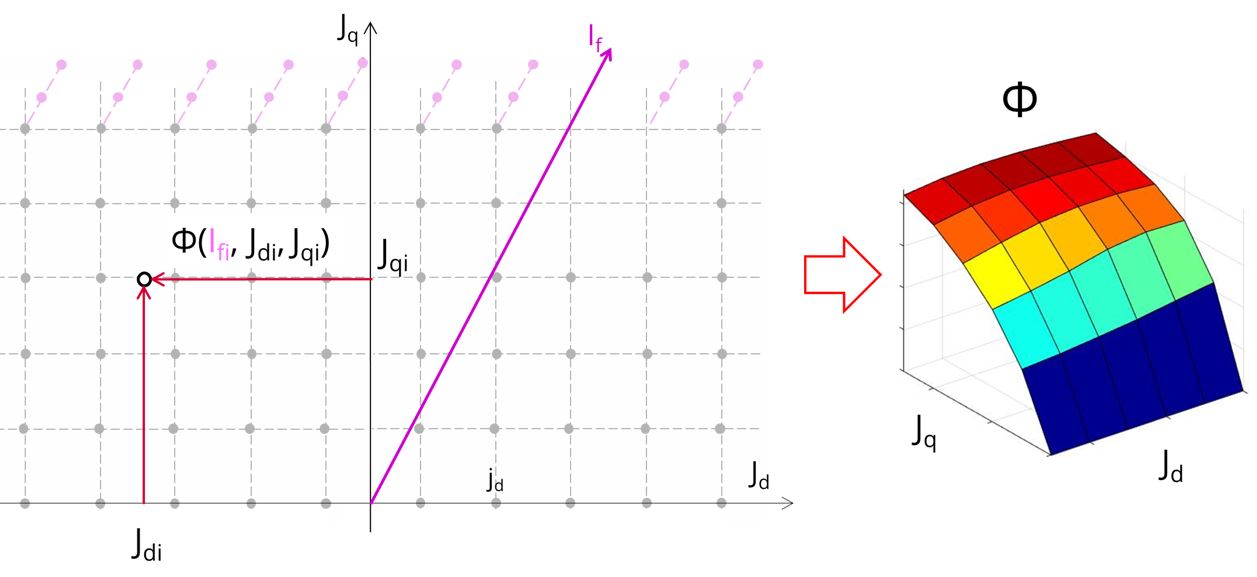 At each level of If, a grid of values (Jd, Jq) is considered. Finite Element modeling (Flux® software – Magnetostatic application) is then performed at every node of the grid. The corresponding flux linkage through each phase is extracted (a, b, c) through the corresponding phases (a, b, c).