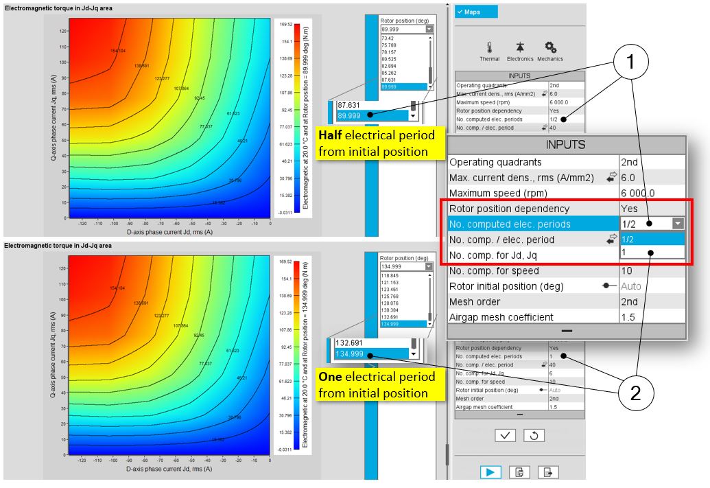 Electromagnetic torque in Jd - Jq area Maximum rotor angular position with half electrical period option (1) in the drop-down menu, and maximum rotor angular position with one electrical period option (2) in the drop-down menu |