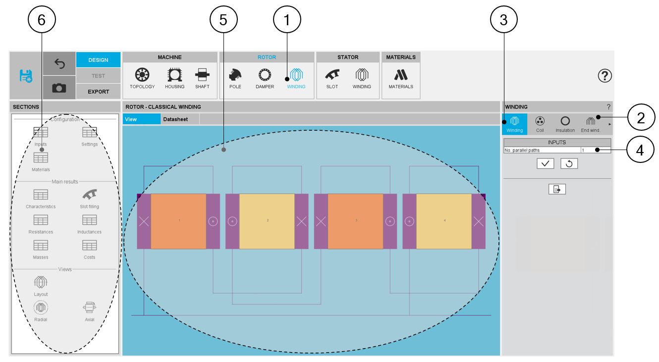 | 3-4 | Winding input parameter panel dedicated for designing of the winding architecture (mainly the number of parallel paths) |