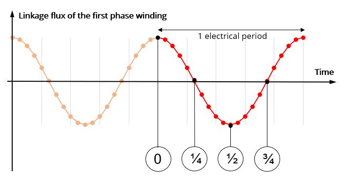 - Instant 1/4: the linkage flux of the first phase winding is supposed to be zero.