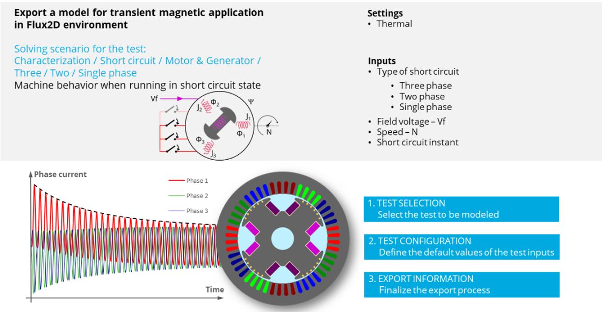 The aim of the export “Characterization - Short circuit – Motor & Generator – Three / Two / Single Phase” is to characterize the behavior of the machine, when considering a short circuit happening between three phases, two phases or a single phase.