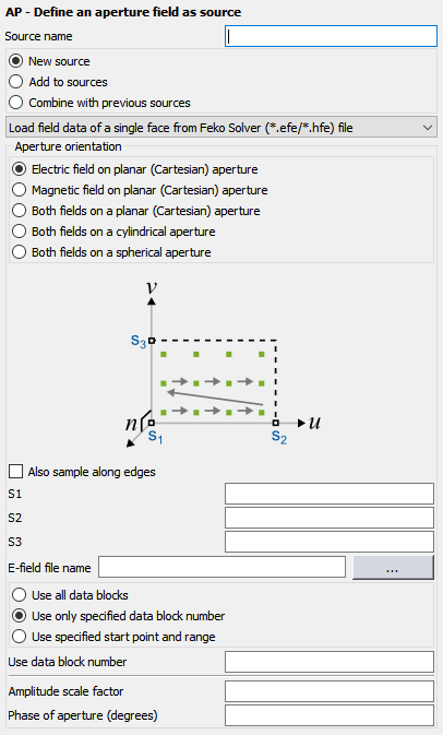 This card defines a planar, cylindrical or spherical aperture of measured or calculated field values that is converted by PREFEKO internally into an equivalent array of electric and magnetic dipoles (A5/A6 cards).