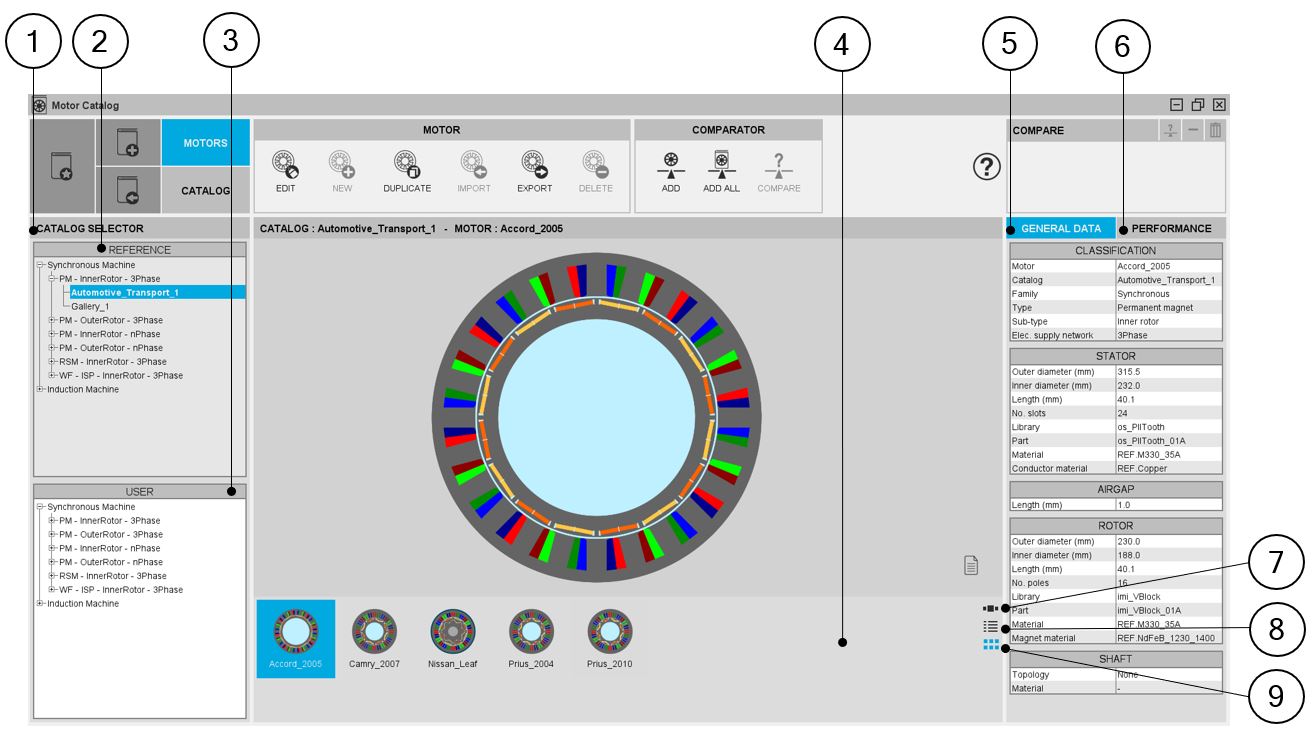 4 | All the motors of the selected catalog are displayed in this area.Three ways are proposed to display and visualize the motors. |