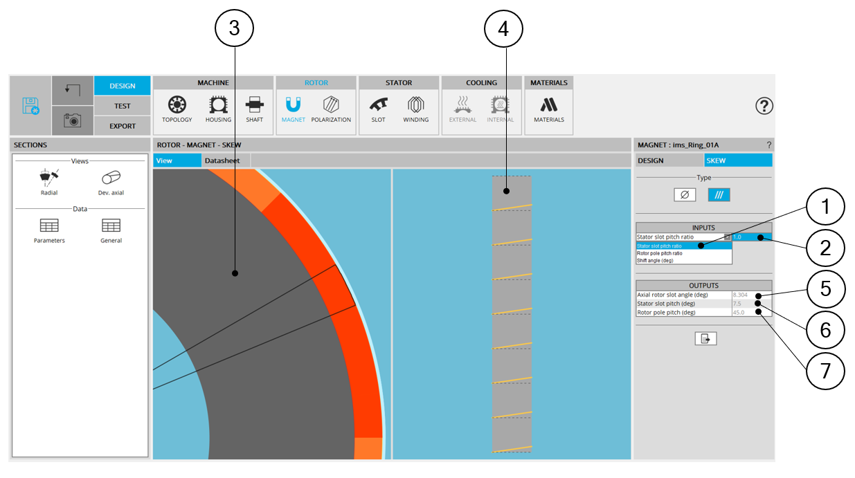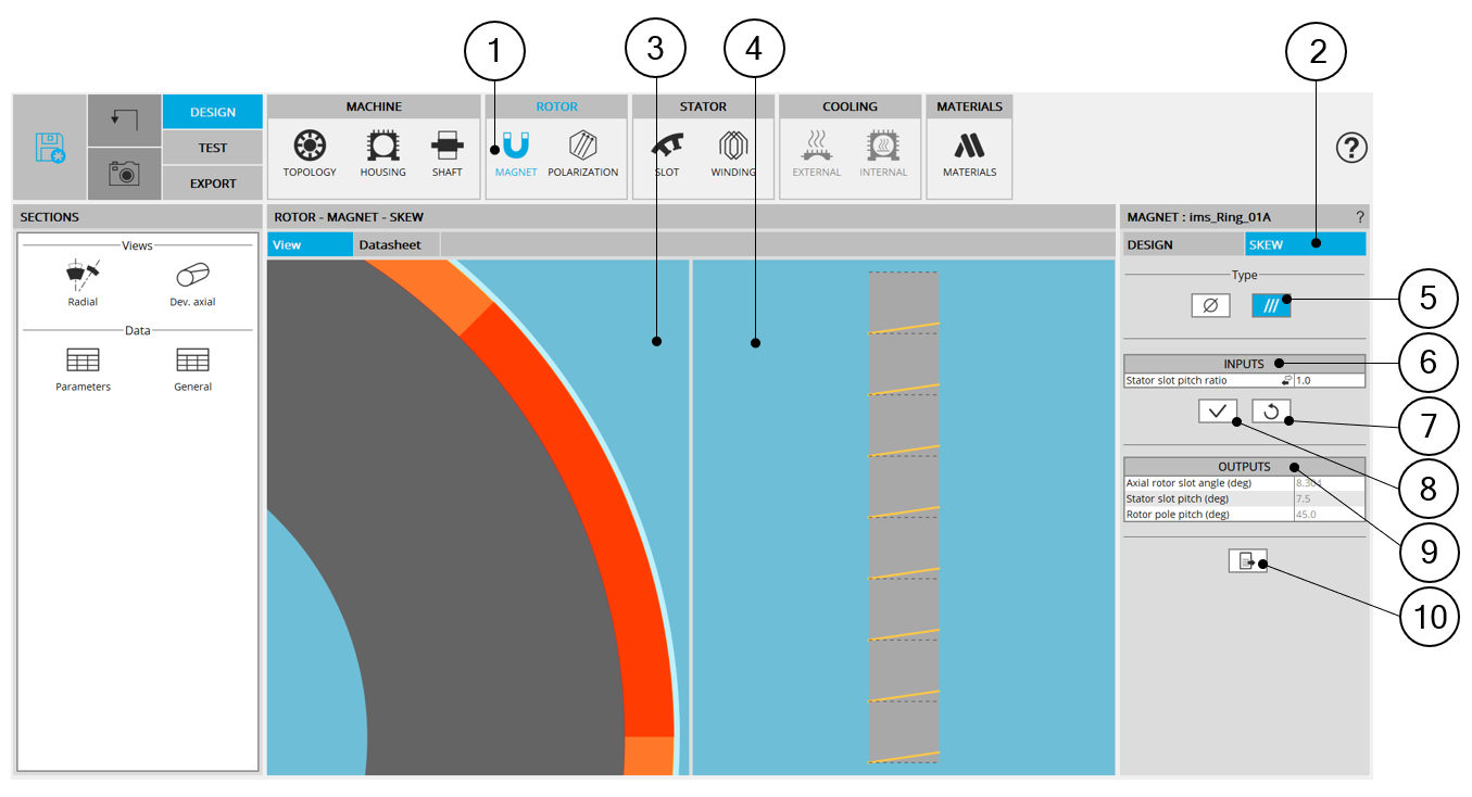 2 | SKEW tab indicates the tools to define the rotor (magnet) skewing angle. |