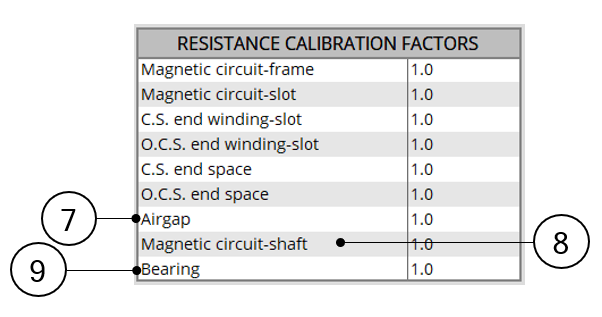 9 | Bearings.This calibration factor tunes the resistances existing across the Connection Side bearing and the Opposite Connection Side bearing.These resistances are the resistances computed directly from the bearing equivalent airgap thickness set by the user in INTERFACE settings. |