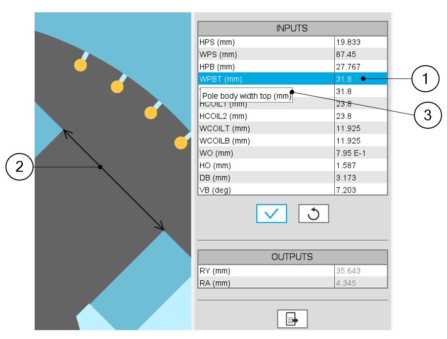 2 | The selection of a parameter label displays the corresponding arrow on the picture. |