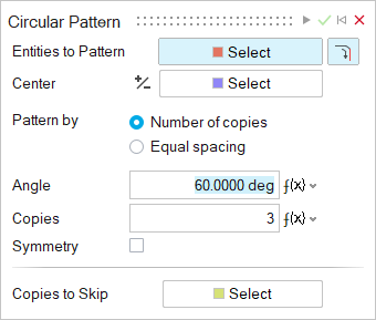 ガイドパネルで、角度を入力します。 コピー数を変更する ガイドパネルで、コピー数を入力します。 選択した中心を中心に対称にパターンを作成する 対称をオンにします。 - オプション: