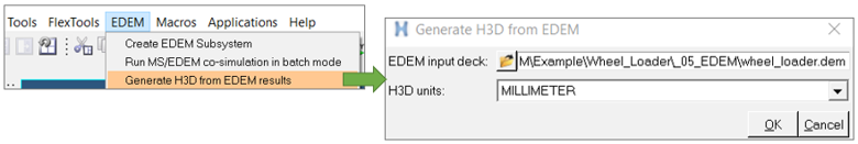 表示されたGenerate H3D from EDEMダイアログでEDEMモデルファイル(.dem)を指定し、変換先の単位を指定します。