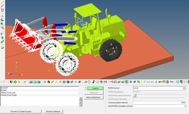 でTransfer and Create Systemをクリックします.MotionSolveのEDEM との連成に必要なエンティティを含むシステムがMotionViewモデルに追加されます。
