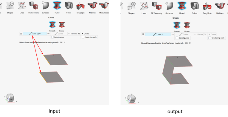 - 入力がCADジオメトリの場合、出力されるジオメトリは、CADジオメトリです。2つのCADエッジからの補間サーフェスの作成では、CADジオメトリサーフェスが生成されます。