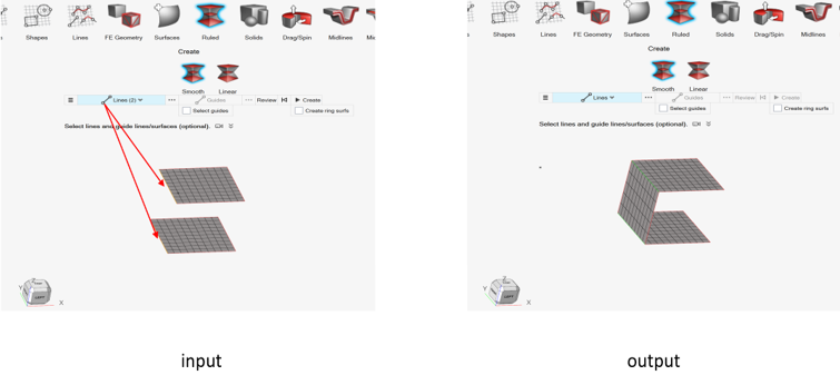 - 入力がFEジオメトリの場合、出力されるジオメトリは、FEジオメトリです。2つのFEジオメトリエッジからの補間サーフェスの作成では、FEジオメトリサーフェスが生成されます。
