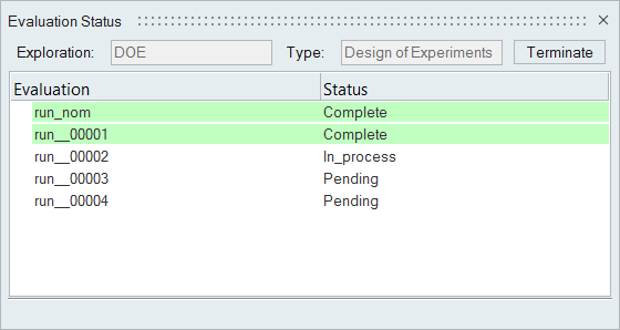 Evaluation Statusダイアログが開きます。このダイアログで各実行の進捗を追跡できます。