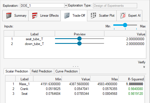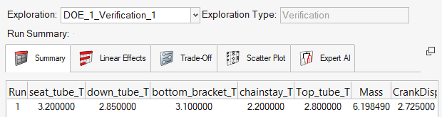 検証とは、1つのソルバージョブを、トレードオフパネルで設定されたままの入力設計変数の値で実行する探索のことです。