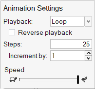 Speed | 再生中にアニメーションのスピードを変更できます。左に動かすと、アニメーションのスピードは落ちます(フレームレートが低下)。スライダーバーを右に動かすと、アニメーションのスピードが上がります(フレームレートが上がります)。スライダーバーを左に動かすと、アニメーションのスピードが下がります(フレームレートが下がります)。モデルのアニメーション速度は、Max Frame Rate欄で設定された値を超えることはありません。アニメーションスピードは、モデルのサイズと使用しているワークステーションのハードウェアのパフォーマンスレベルにも左右されます。 |