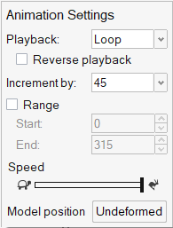 Increment by | forwardボタンとreverseボタンがクリックされる度に、Increment by欄内の値がCurrent time、Animate start、Animate end欄に追加または差し引きされます。アニメーション中、各ウィンドウには、Current timeの値に最も近く、それを越えないタイムステップが表示されます。アニメーション表示に使用するインクリメントの種類に基づき、ドロップダウンメニューからTimeまたはFrameを選択します。 Modalアニメーションモードでは、このオプションは角度に関する増分となり、利用可能な値のメニューから選択する必要があります。Interpolation/Linear staticモードでは、補間ステップの増分です。