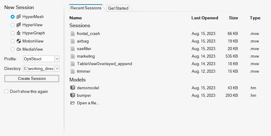 最近のセッションを開く Recent Sessionsタブには、最近開いたHyperMeshモデル(.hm)、セッション(.mvw)、MotionViewモデル(.mdl)ファイルが一覧表示されます。セッションを直接開くファイルを選び、そのファイルに関連するクライアントとプロファイルを設定します。 - オプション: