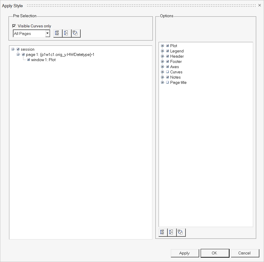 現在のプロットの属性を選択し、各ページ上のそれぞれのプロット、もしくは現在のページ内の各プロットに適用します。