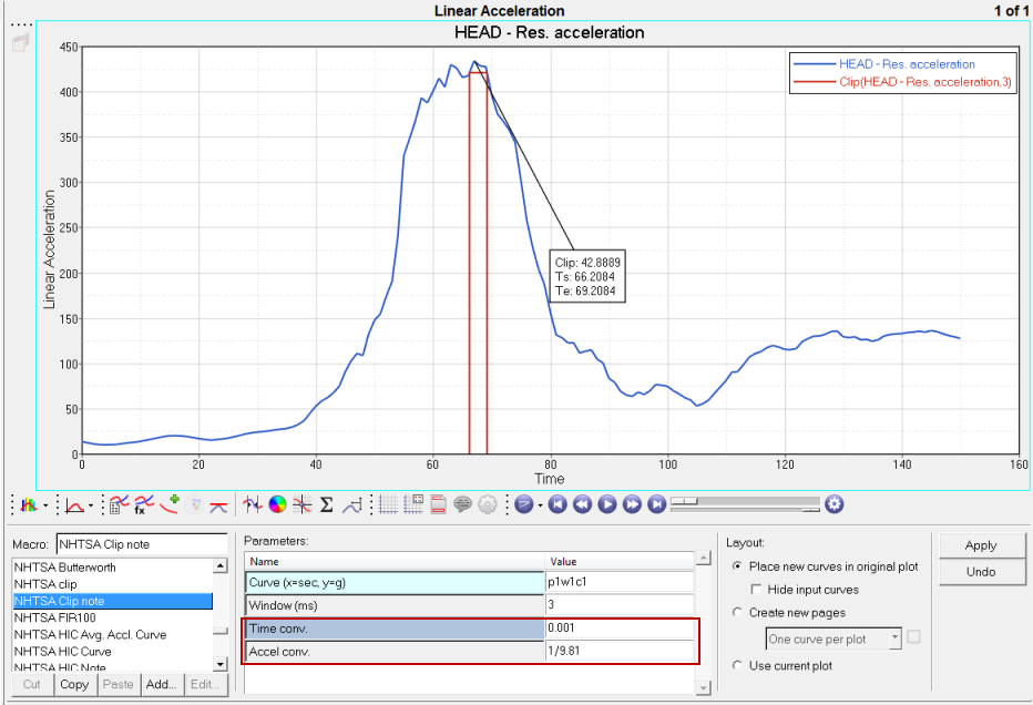 下の図では、選択されたカーブについて単位が無効となっています。カーブの読み込み後、Injuryメニューからclipなどの車両安全ツール(VST)関数を選択します。単位が有効化されていない場合は、カーブが正しく適合するように、Timv conv. およびAccel conv. 欄にスケーリング係数を手動で入力する必要があります。