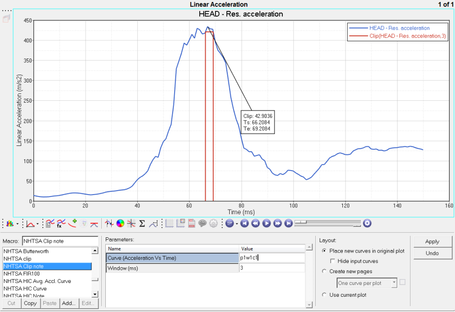 単位が有効化されている場合、Convert Unitsコンテキストメニューを使って、下の図内のTime軸の値をmsからsへ、あるいはLinear Acceleration軸をm/s2からgravitiesへ変更することも可能です。これを行っても、図内のカーブの注釈に示される値に影響を及ぼすことはなく、同じに留まります。