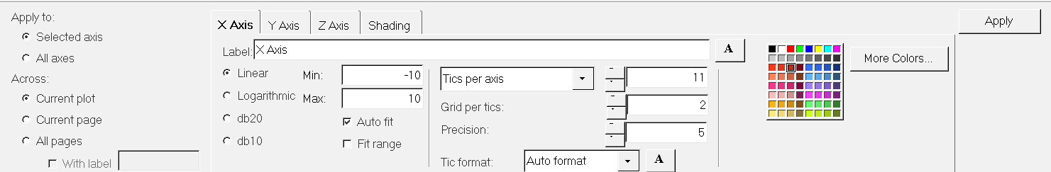 - 軸は、線形スケール(Linear)、対数スケール(Logarithmic)またはデシベルスケールdB10、dB20 scale)での表示が可能です。異なるスケールで各軸を表わすことができます。各軸に適切なスケールを選択するには、ラジオボタンを使用します。