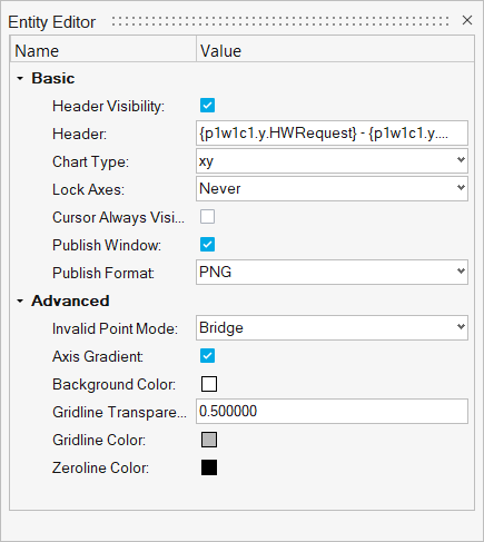 - Editをクリックするとエンティティエディターが表示され、軸のプロパティを編集できます。軸の色、ラベル、ラベルと目盛のフォントの変更や、固定範囲の設定を行うことができます。特定属性の編集の詳細については、Axesビューをご参照ください。