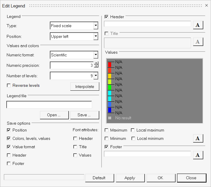 - より多い、またはより少ないコンターバンドおよび対応するレンジを表示します。レジェンド内に表示可能なバンドの最小数は2、最大数は32です。