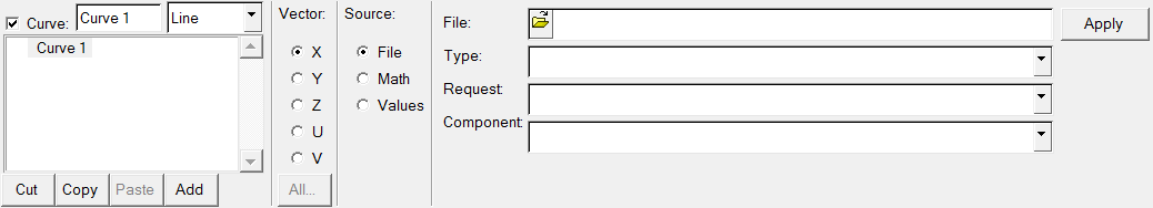 を選択した場合、X、Y、Z、U、VベクトルがExpression = 欄に表示されます。Vectorの下で新しいデータは、ソースファイルより選択、プログラムのカーブカリキュレータを使って数学的に定義、あるいは値を入力します。どのソースを選択するかによって、Define Curvesパネルのオプションは変化します。