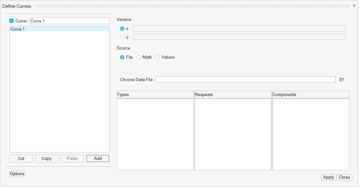 アクティブウィンドウについてカーブリストをコントロールするには、Cut、Copy、Paste、Addボタンを使用します。カーブは、別のウィンドウにコピー、ペーストすることができます。また、リストへのカーブの追加と削除も可能です。