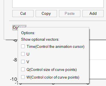 X、Yベクトルはダイアログの上部に表示されます。これらのベクトルのデータソースは、テキスト欄に表示されます。ベクトルラジオボタンまたは対応するテキストボックスをクリックして、編集するベクトルを選択します。UおよびVベクトルのサポートにより、プロッティングに先がけてカーブ上で数学的計算を行うことが可能です。U、V、W、Q、Tベクトルはオプション。ダイアログから、Optionsを使用してアクセスします。