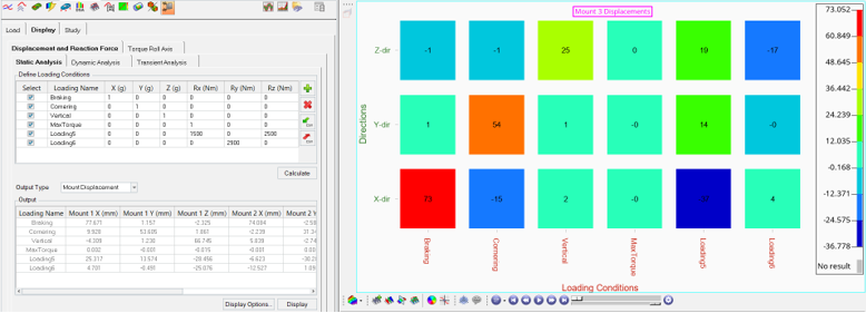 マウント変位と反力 静的、動的、過渡的な様々な荷重条件下でマウントの変位や反力をプロットし、マウントの耐荷重や車両構造との干渉を把握するのに役立ちます。オプションで、カスタムの静的ロードケースを追加することができます。 図 1. Mount Optimizationユーティリティ - Displayタブ - Displacement and Reaction Forcesサブタブ