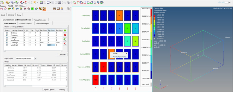 Mount Optimization - Displayタブ 剛体モードの振動数とそれに対応する運動エネルギー分布をレビューします。右クリックによるコンテキストメニューで、剛体モードを表示、視覚化できます。 図 1. Mount Optimizationユーティリティ - Displayタブ