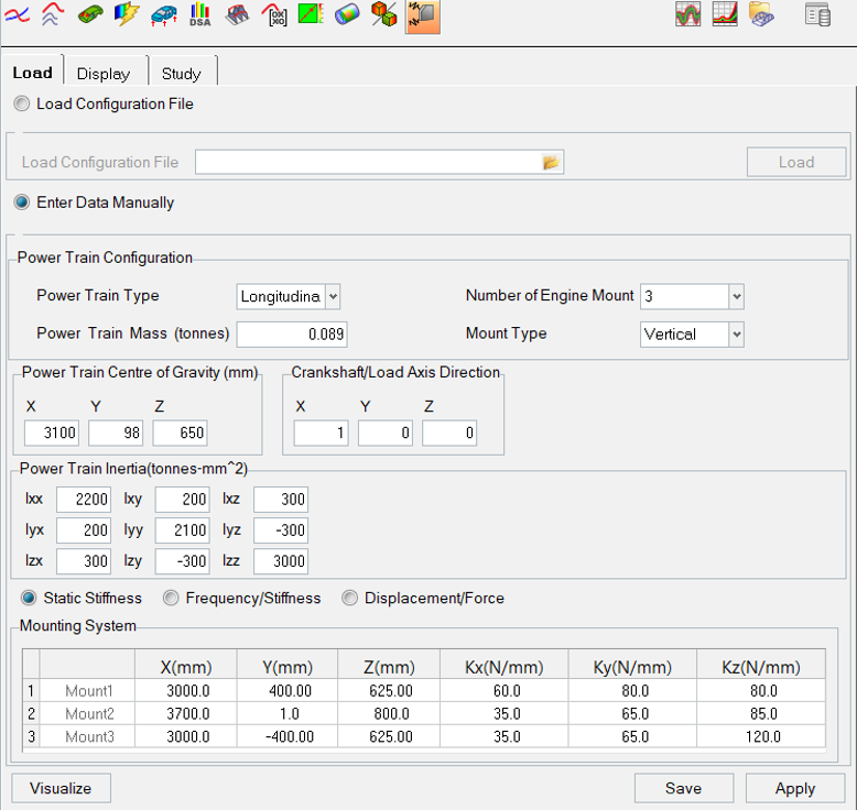 パワートレインおよびマウントコンフィギュレーションデータを手動で入力するか、コンフィギュレーションファイルからデータを読み込みます。マウント剛性には静的なものと非線形なものがあります。