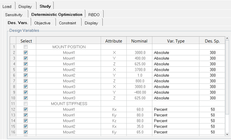 設計変数の設計空間を指定します。図 1. Mount Optimizationユーティリティ - Studyタブ - Deterministic Optimizationサブタブ - Des.Vars.