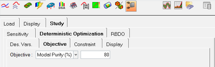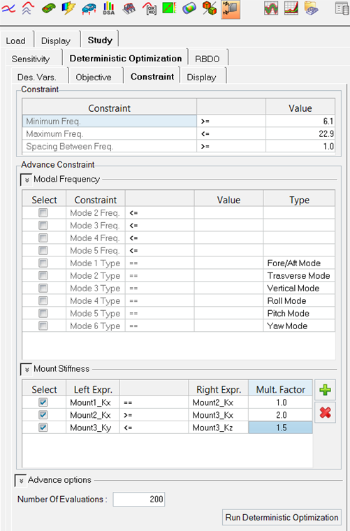 剛体モードの分離の目的を定義し、剛体モード振動数の制約を作成し、マウント剛性、位置、傾斜の観点から変数の設計空間を指定することで、決定論的最適化と実行を設定します。