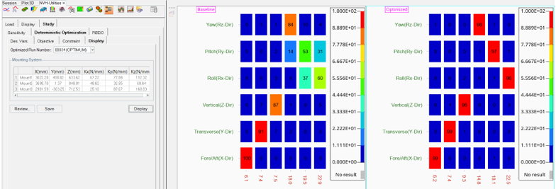 Displayタブから、剛体モードの振動数と運動エネルギー、およびベースライン vs 最適化値を表示して比較します。比較ビューに設計変数とベースライン vs 最適化値を表示されます。詳細なスタディ用に、最適化された設計変数を含むコンフィギュレーションファイルを保存できます。