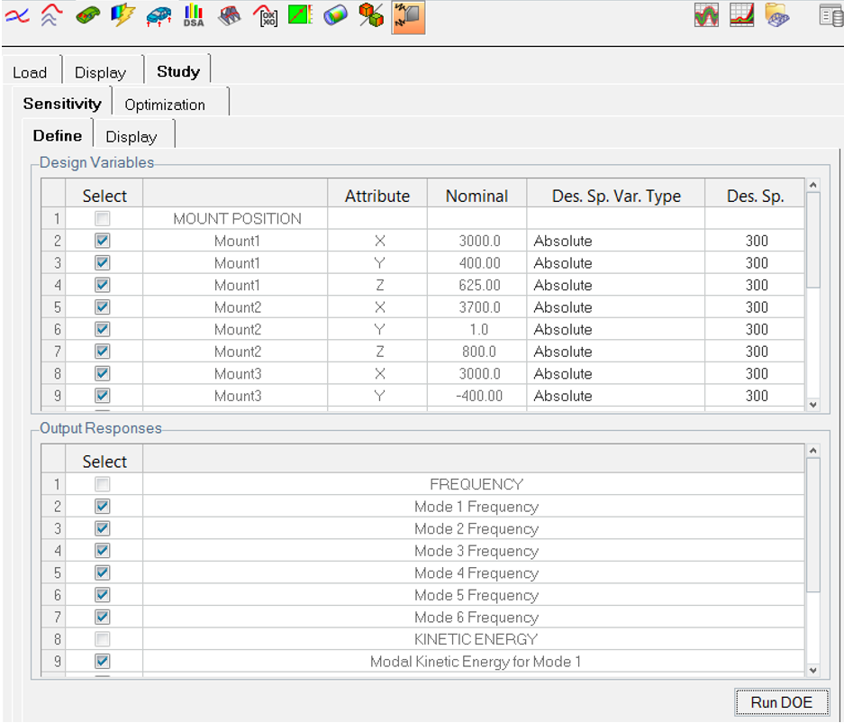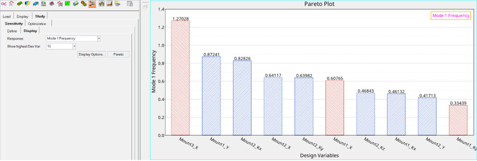 感度 実験計画(DOE)を設定して実行するための設計変数と出力応答を定義します。 図 1. Mount Optimizationユーティリティ - Studyタブ - Sensitivityサブタブ - Define パレートプロットには、さまざまな出力応答に対する変数の感度が表示されます。 図 2. Mount Optimizationユーティリティ - Studyタブ - Sensitivityサブタブ - Display