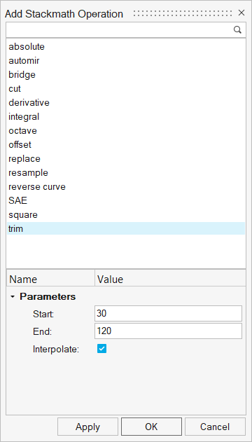 を使って数学関数をフィルタリングし、カーブに適用します。カーブに対して数学演算が適用されると、カーブは重複することなく数学関数によって再描画されます。ダイアログ内のName/Valueエンティティエディタは、必要に応じて編集が可能である数学関数用のパラメータを表示します。表示されるパラメータは、選択された数学関数に基づきます。図 5. Add Stackmath Operation