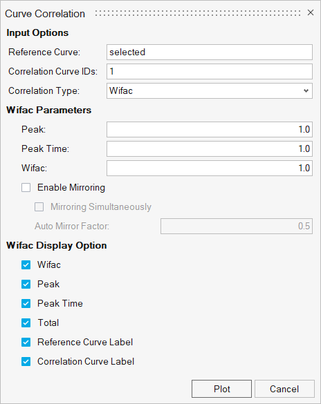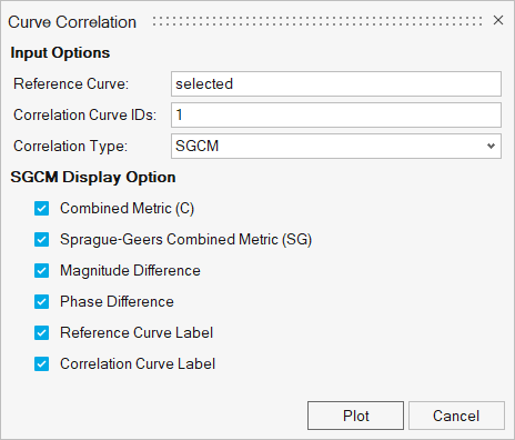 - Curve Correlationでは、デフォルトの設定をそのままにするか、もしくは必要に応じてオプション群を編集することができます。プロットウィンドウ内に相関メトリックを含んだ注釈を表示させるには、Plotをクリックします。