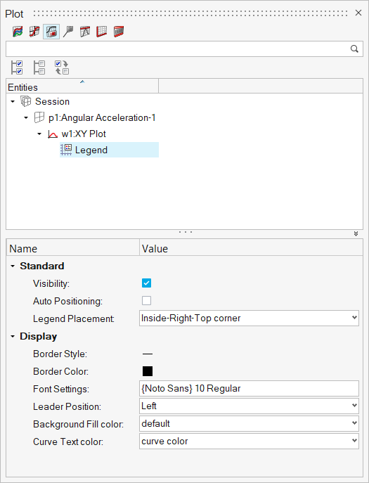 Legendsビューは、セッション内のレジェンドのみを、対応するページおよびプロットフォルダーにグループ化して表示します。レジェンドをクリックすると、 エンティティエディターにレジェンドのプロパティが表示されます。