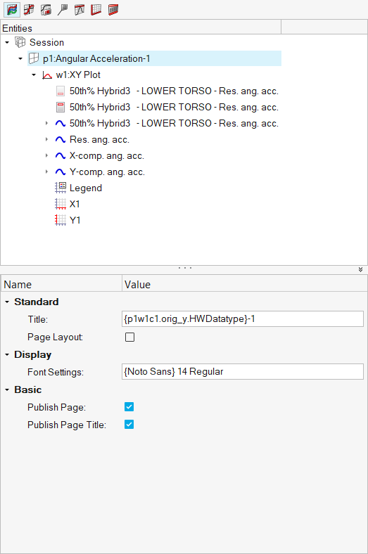 Plotブラウザのビュータイプ(Plots、Curves、Legendsなど)のいずれかが選択されていると、Plotブラウザツリーの最上部でページフォルダーを選択し、そのプロパティをPlotブラウザの下半分(エンティティエディター)に表示することができます。