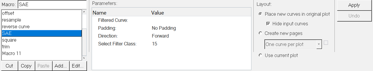 選択されたマクロに関連したパラメータは、Parametersリスト内に表示されます。パラメータは、カーブ(curve)またはスカラー(scalar)のいずれかです。カーブパラメータは、コレクターとして表示されます。コレクターをクリックすると、プロットからカーブをグラフィカルに選択することができます。コレクター上をダブルクリックすると、Select Curveダイアログが表示されます。スカラーパラメータは、テキストボックスとして表示されます。パラメータは通常、セッション内からカーブを集めて数学関数の形で使用する際に必要となります。結果の計算には、Templex関数や外部関数を含む任意の数学関数の使用が可能です。マクロはパラメータの複数の引数をサポートしています。