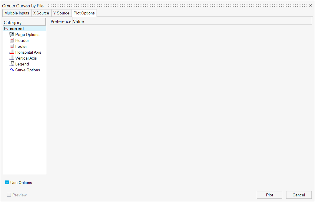 Plot Optionsタブには、左側にツリー、右側にProperties Tableが含まれています。このツリーから、カーブに適用したいプロットエンティティを選択します。Properties Tableは、選択されたプロットエンティティのプロッティングと現行値をリストします。