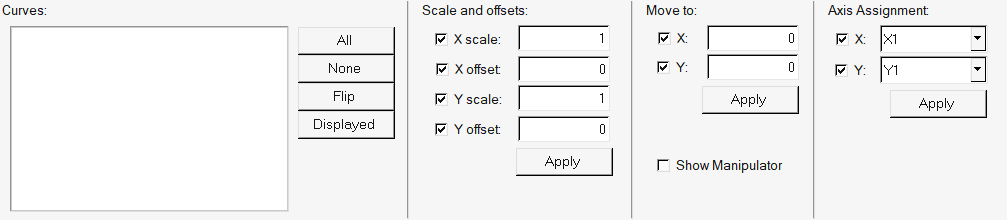 カーブのスケーリング、オフセットおよび軸の割り当ては、移動パネルを用い、複数のカーブに適用できます。