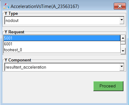 Head Impactorを選択した場合、ツールは、Displacement vs TimeグラフとAcceleration vs Timeグラフの両方の最初の位置のY-type、Y-request、Y-componentを要求します。次のポイント以降は、同じY-Type、Y-request、Y-componentを探します。同じY-Typeは存在するもののY-requestが利用できない場合、ツールはY-requestが1つしかないのか確認します。複数のY-requestが存在する場合、ユーザーはそれぞれのポイントにY-requestを入力する必要があります。