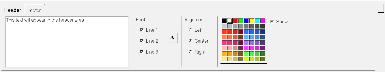 - ヘッダーまたはフッターのテキストの行ごとに、異なるフォント属性を指定できます。ユーザー定義可能な3つのスタイルが使用できます: