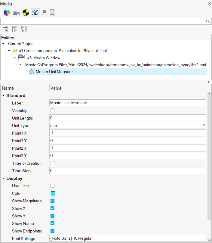 - Master Unit Measureが定義されていない場合、単位オプションはデフォルトで無効です。定義されると、このオプションは自動的にアクティブとなり、チェックマークが入ります。これは、Magnitude、Delta X、Delta Yの値を示す際、およびメジャーから生成されたカーブをプロッティングする際に、定義済みの単位およびMaster Unit Measureで定義された画素変換係数を使用しなければならないということを指定します。これは、すべてのメジャーに適用される全体的なセッティングです。