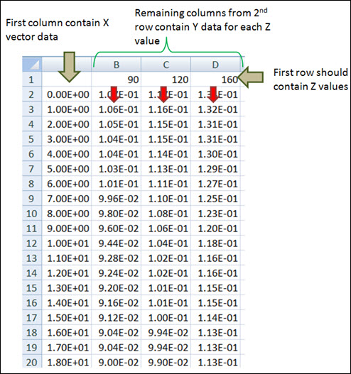3Dスプラインは、xベクトル(列)と1つ以上のyベクトルで構成されます。各yベクトルは特定のz平面上で定義されます。