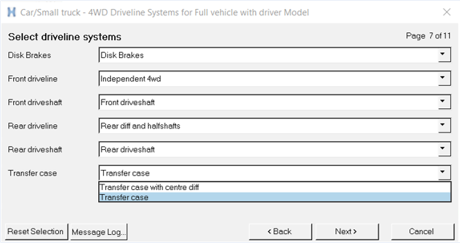 MotionViewの乗用車 / 小型トラックライブラリでは、フロントとリアのドライブシャフトを駆動するために粘性力が使用されます。メカニズムのタイプは、ウィザードによる選択を通して車両モデルを構築するときに、“4WD Driveline Systems”ページで選択できます。