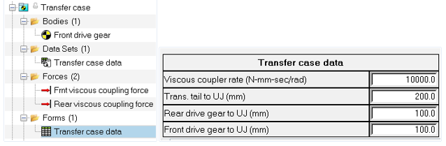 トランスファーケースのパラメータ、特にカプラー定数 / 比は、トランスファーケースシステムで提供されるフォームを使用して編集できます。