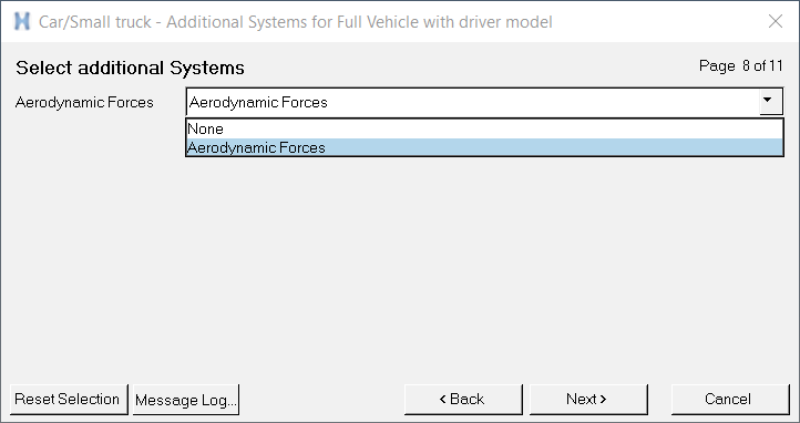 - 追加のシステムページでAerodynamic Forcesを選択して、モデル選択を完了します。